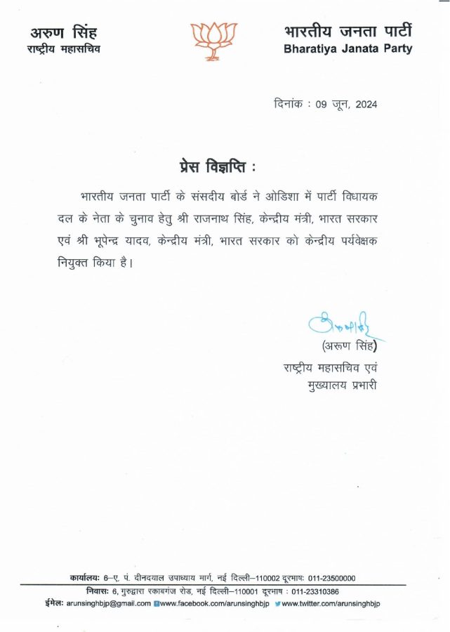 भाजपा के संसदीय बोर्ड ने ओडिशा में पार्टी विधायक दल के नेता के चुनाव हेतु पर्यवेक्षक नियुक्त किया..