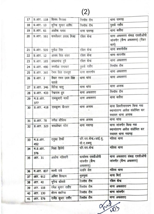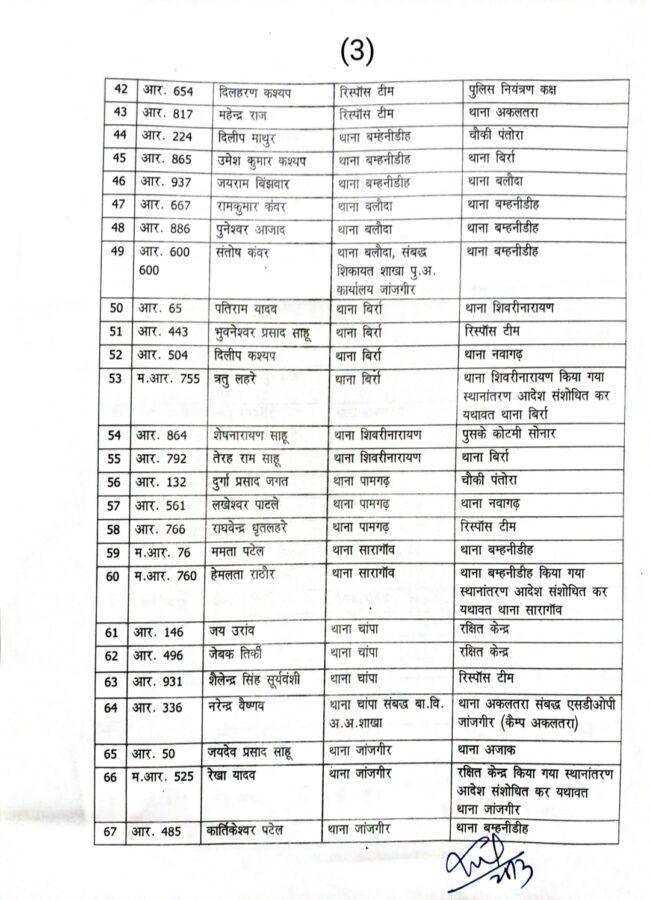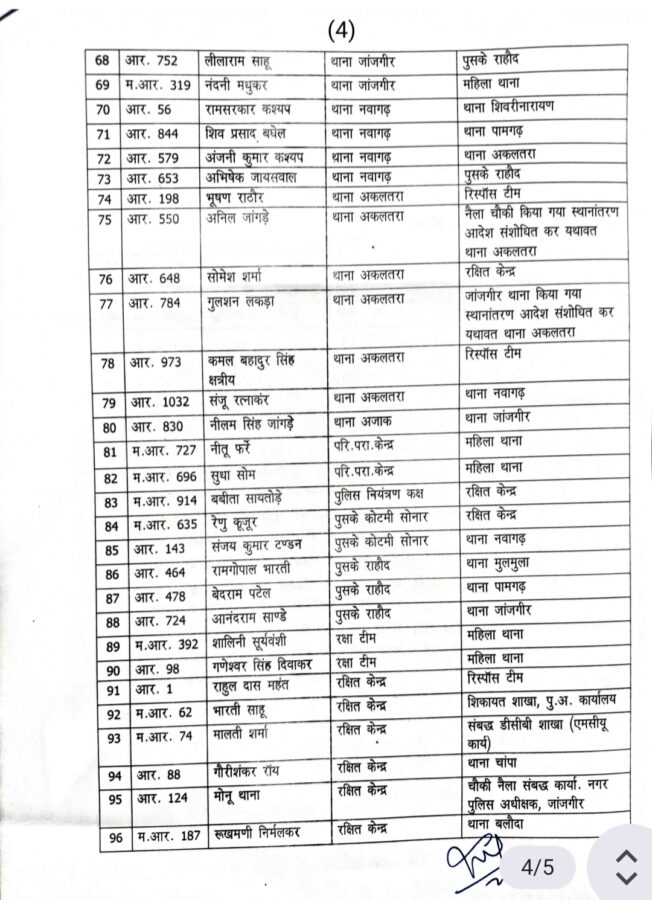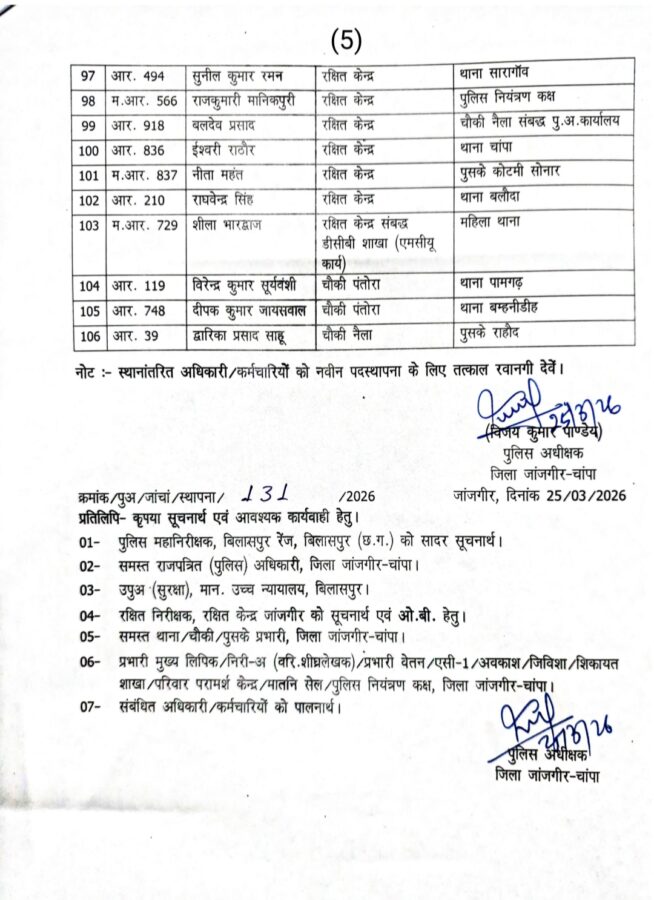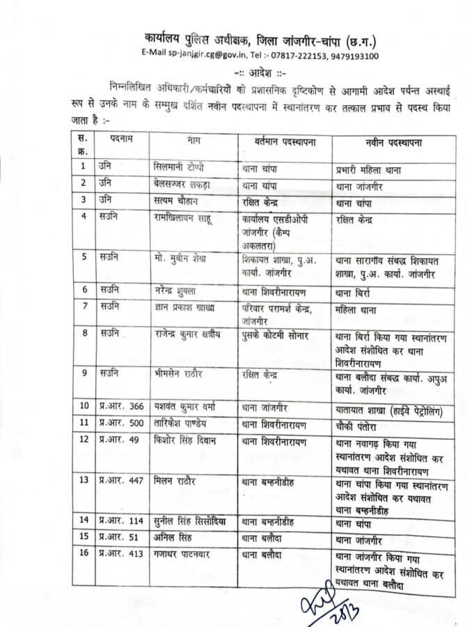 जांजगीर चाम्पा: जांजगीर चांपा जिले में पुलिस अधीक्षक श्री विजय कुमार पाण्डेय IPS ने व्यापक स्तर पर तबादले किए हैं। 106 पुलिस अधिकारी और कर्मचारियों को एक स्थान से दूसरे स्थान पर पदस्थ किया गया है। नवीन महिला थाना में 11 पुलिस अधिकारी और कर्मचारियों की पदस्थापना की गई है, जिसकी प्रभारी उपनिरीक्षक सिलमानी टोप्पो रहेंगी। 31 मार्च को IG बिलासपुर द्वारा महिला थाना का शुभारंभ किया जाएगा।