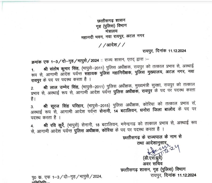 छत्तीसगढ़: राज्य शासन द्वारा भारतीय पुलिस सेवा के अधिकारियों के पदस्थापना सम्बन्धी आदेश प्रसारित किए गए हैं।