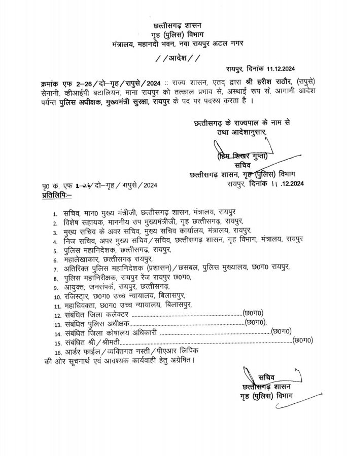छत्तीसगढ़: राज्य शासन द्वारा राज्य पुलिस सेवा अधिकारी श्री हरीश राठौर के पदस्थापना सम्बन्धी आदेश प्रसारित किए गए हैं।