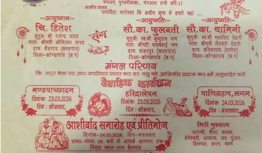 नवदंपति की जानकारी के अनुसार, दूल्हा हितेश (सुपुत्र गजेंद्र यादव, ग्राम बैलगांव) है, जबकि प्रथम दुल्हन फुलबती (सुपुत्री स्व. बुद्धुराम नाग, ग्राम शंकरपुर) और द्वितीय दुल्हन यामिनी (सुपुत्री स्व. भावसिंह देहारी, ग्राम बनियागांव) हैं।